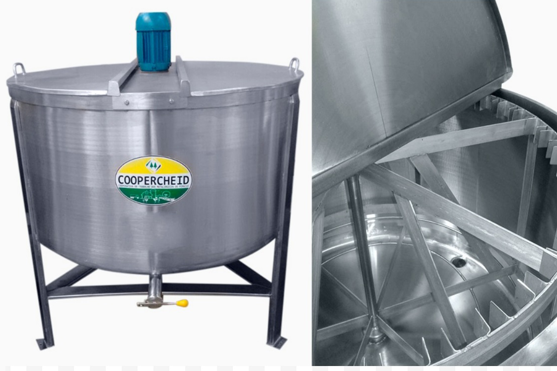 Centrífuga marca COOPERCHEID para mel, construída em Aço Inoxidável AISI 304, com capacidade de 30 CAIXILHOS, 50 CAIXILHOS e 70 CAIXILHOS, contendo inversor de frequência com comando externo e saída com registro borboleta.